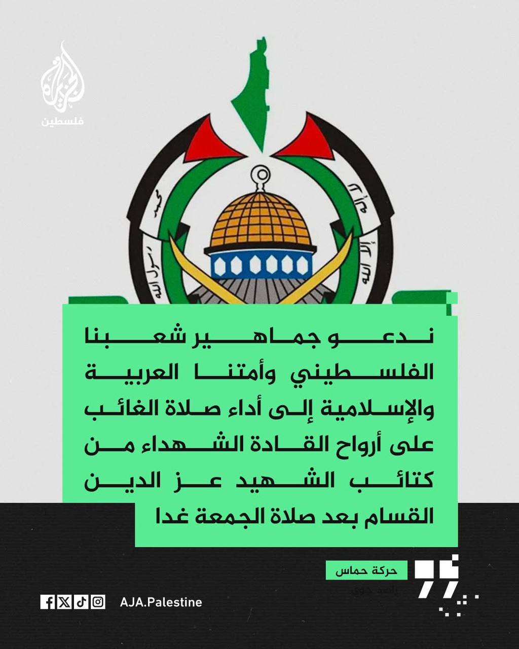 حركة حماس تدعو جماهير شعبنا الفلسطيني وأمتنا العربية والإسلامية في كل أنحاء العالم إلى أداء صلاة الغائب على أرواح القادة الشهداء من كتائب الشهيد عزّ الدين القسَّام